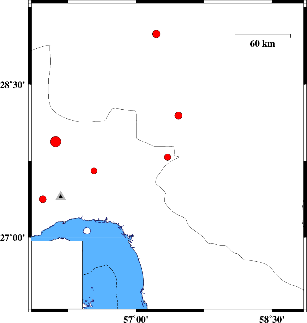 | 2023/07/06 | 15:09:53.8 | 18:39:53.8 | 27.789 | 57.349 | 12 | ML:3.2 | Hormozgan Province, 42 km North-East of Dehbarez | ||