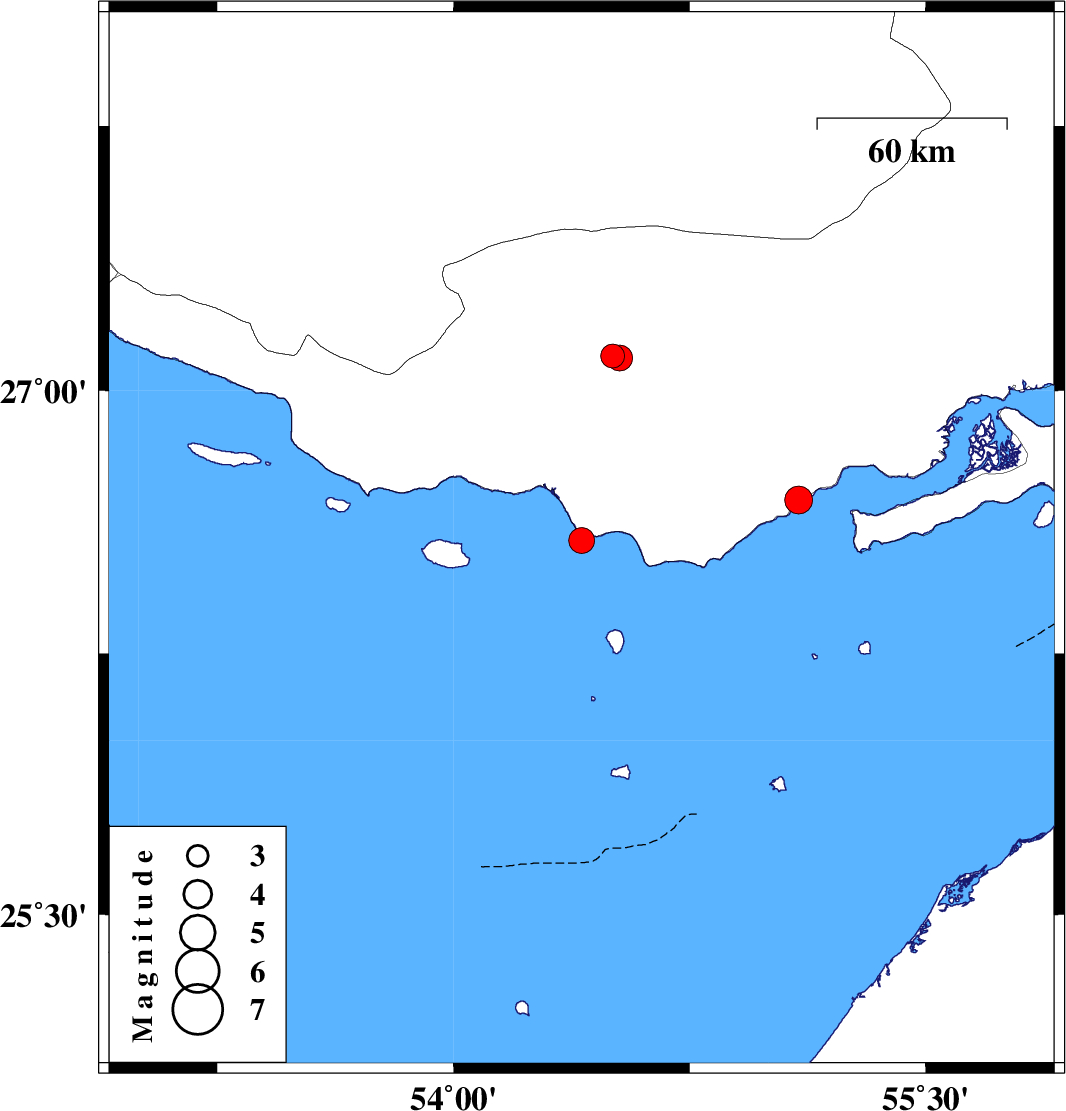 | 2023/07/04 | 02:20:08.4 | 05:50:08.4 | 27.093 | 54.528 | 12 | ML:3.6 | Hormozgan Province, 20 km South-East of Bastak | ||