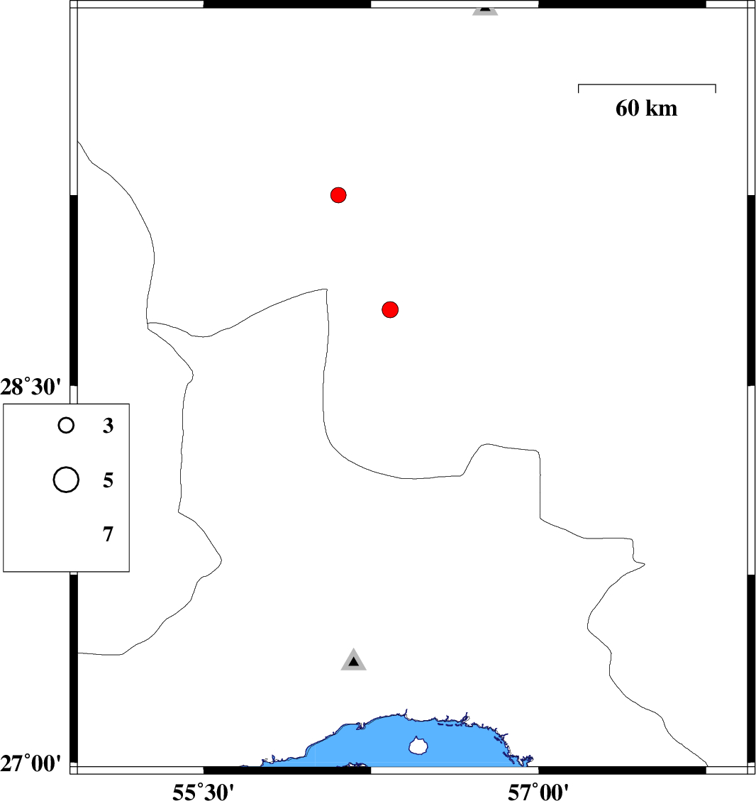 | 2023/07/20 | 04:12:27.3 | 07:42:27.3 | 28.483 | 56.435 | 12 | ML:3.1 | Kerman Province, 56 km North-East of Hajiabad | ||