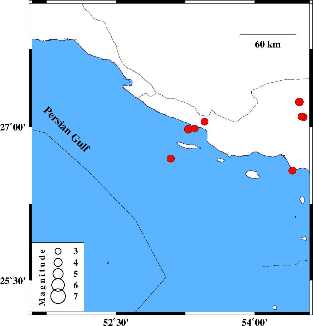 | 2023/07/25 | 11:04:08.7 | 14:34:08.7 | 26.981 | 53.353 | 8 | ML:3.4 | Persian Gulf, 43 km South-East of Lamerd | ||