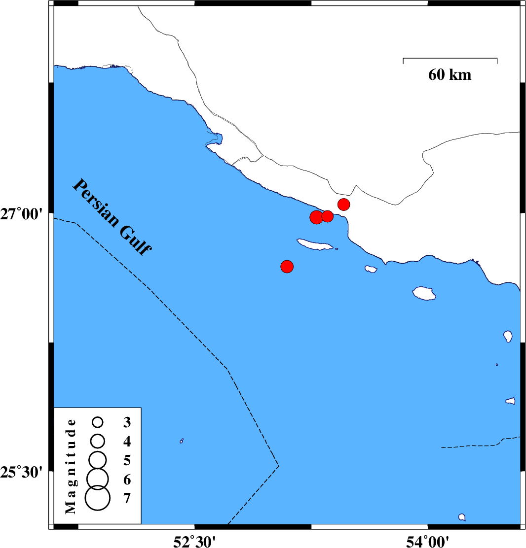 | 2023/07/25 | 10:23:34.1 | 13:53:34.1 | 26.975 | 53.284 | 12 | ML:3.9 | Persian Gulf, 41 km South-East of Lamerd |