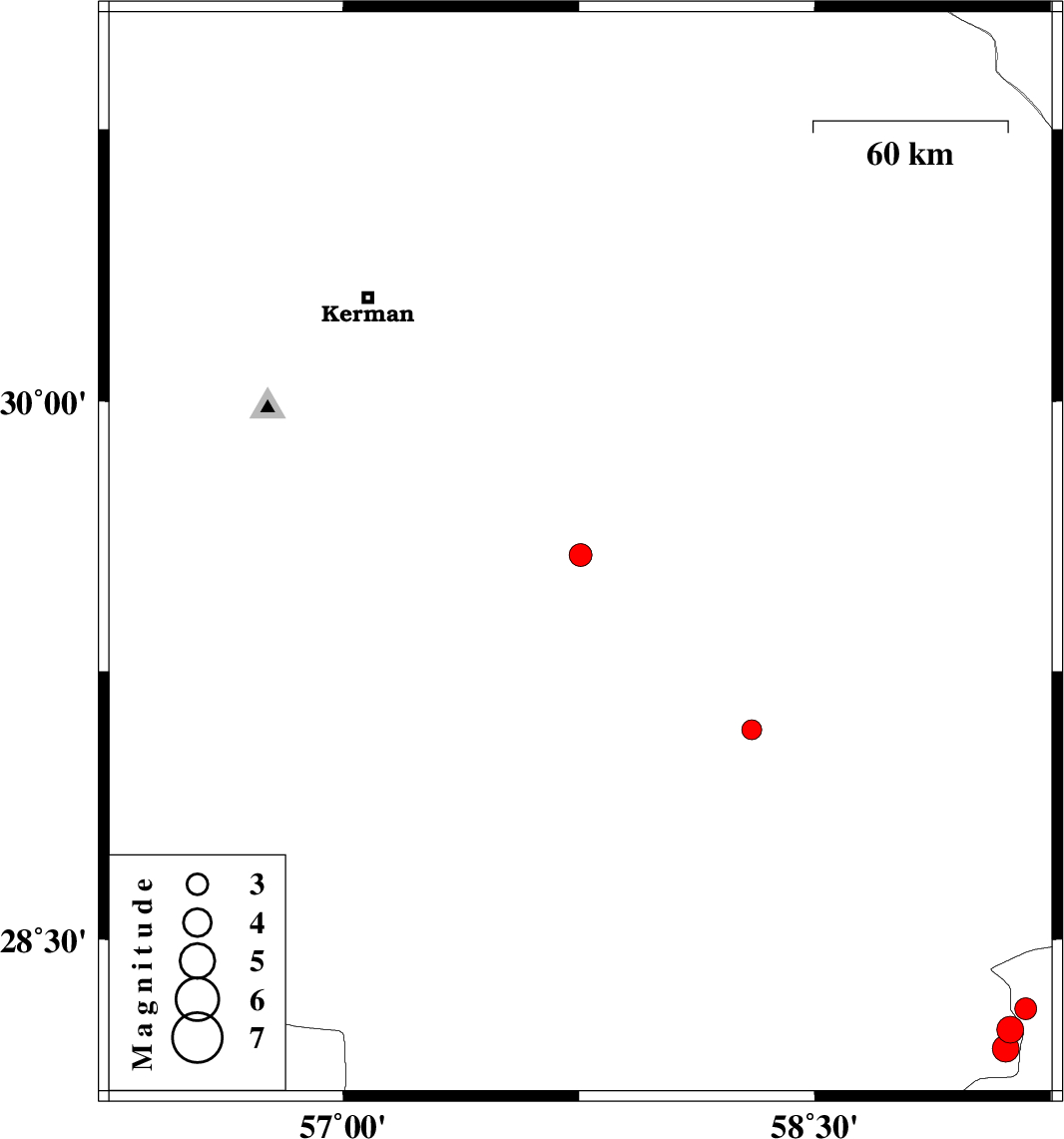 | 2023/07/25 | 01:10:49.8 | 04:40:49.8 | 28.192 | 59.107 | 12 | ML:3.8 | Kerman Province, 141 km North-East of Kahnuj | ||