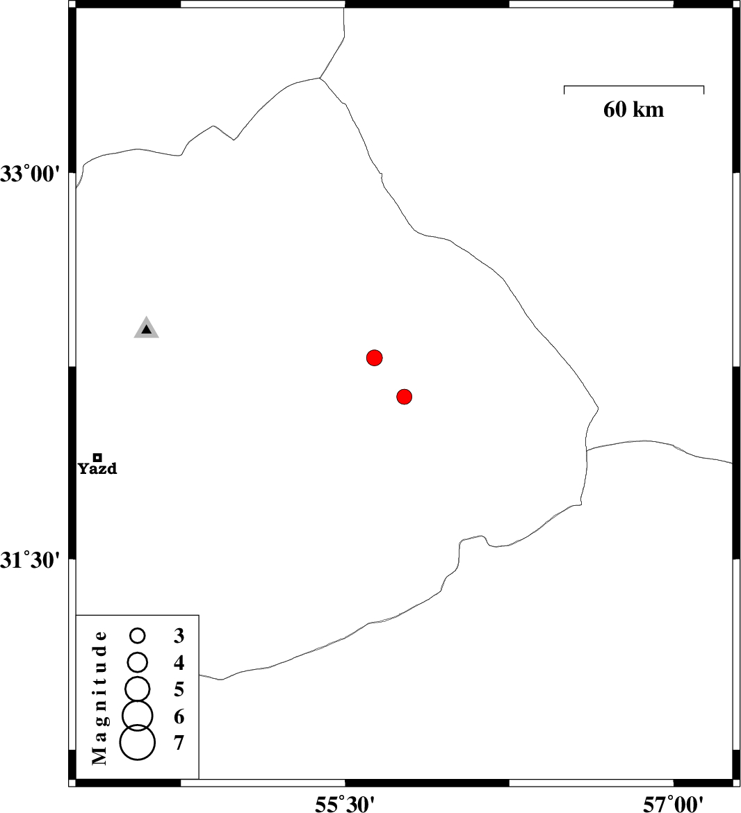 | 2023/08/05 | 07:31:15.2 | 11:01:15.2 | 32.283 | 55.633 | 12 | ML:3.3 | Yazd Province, 79 km North-East of Bafq |