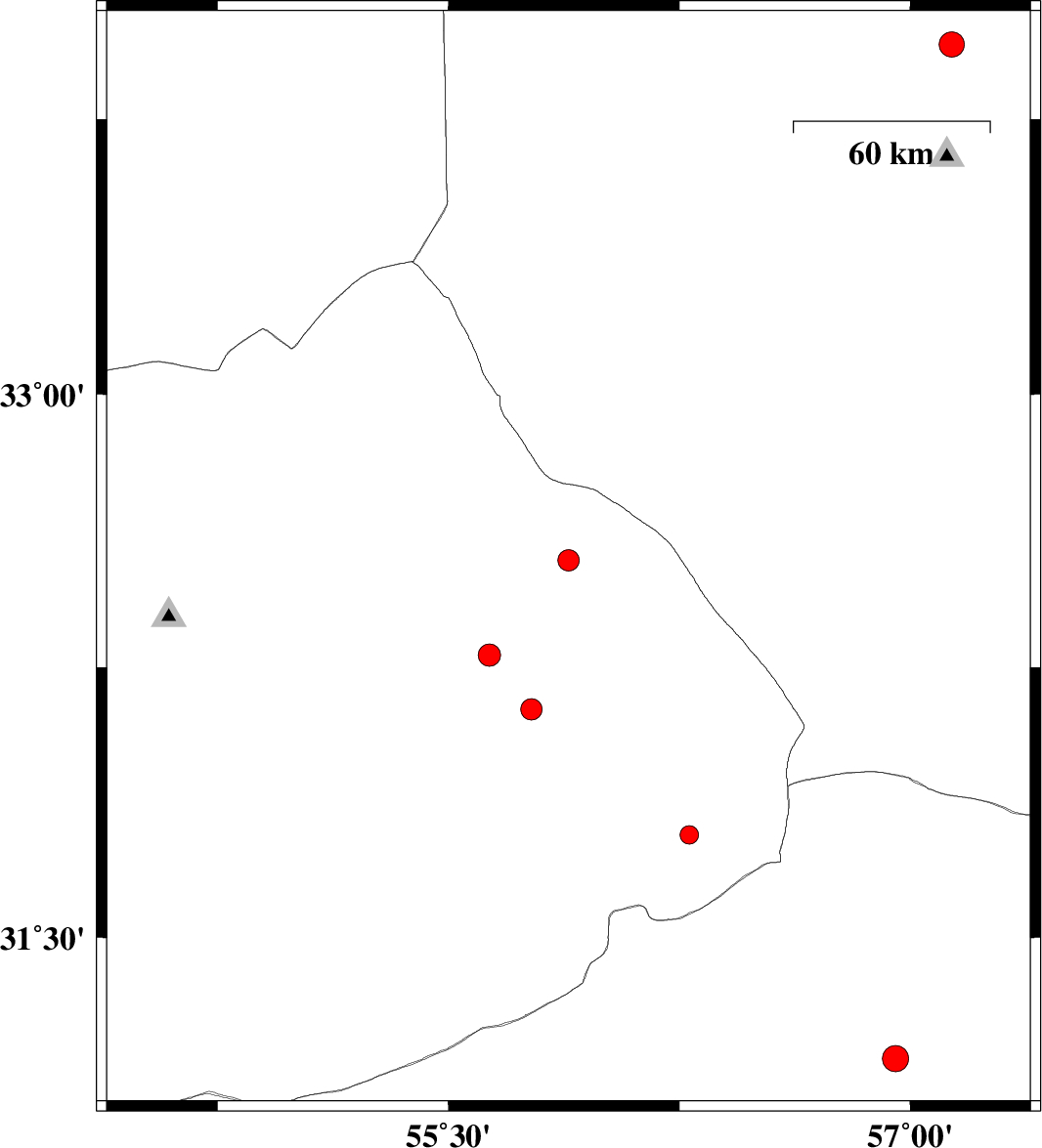 | 2023/08/04 | 18:00:10.1 | 21:30:10.1 | 33.953 | 57.135 | 12 | ML:3.6 | Khorasan(center) Province, 44 km North-East of Tabas | ||