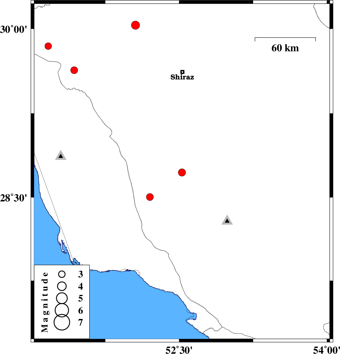 | 2023/08/15 | 14:46:13.2 | 18:16:13.2 | 29.847 | 51.171 | 12 | ML:3.1 | Fars Province, 45 km South-West of Nurabad | ||
