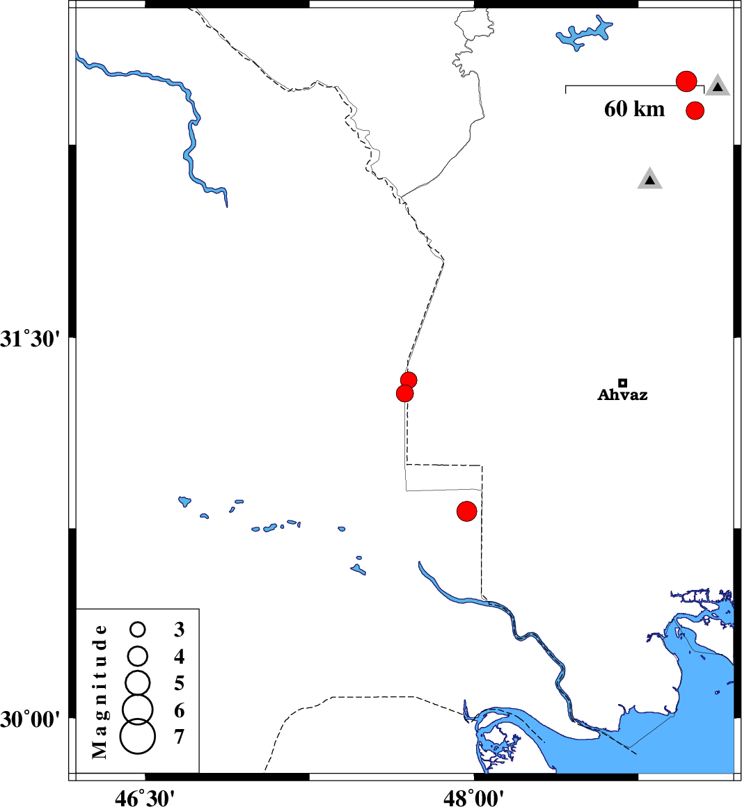 | 2023/07/24 | 21:22:40.9 | 00:52:40.9 | 30.817 | 47.967 | 16 | ML:4.1 | Iraq, 37 km North-East of Al Basrah |