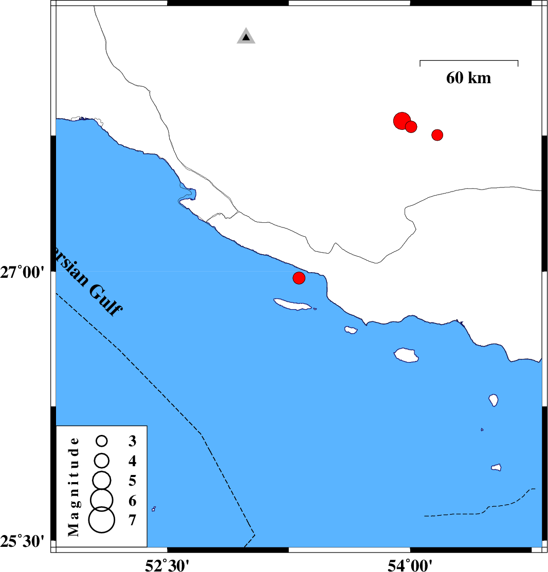 | 2023/08/21 | 19:38:47.2 | 23:08:47.2 | 26.963 | 53.313 | 9 | ML:3.4 | Persian Gulf, 44 km South-East of Lamerd | ||