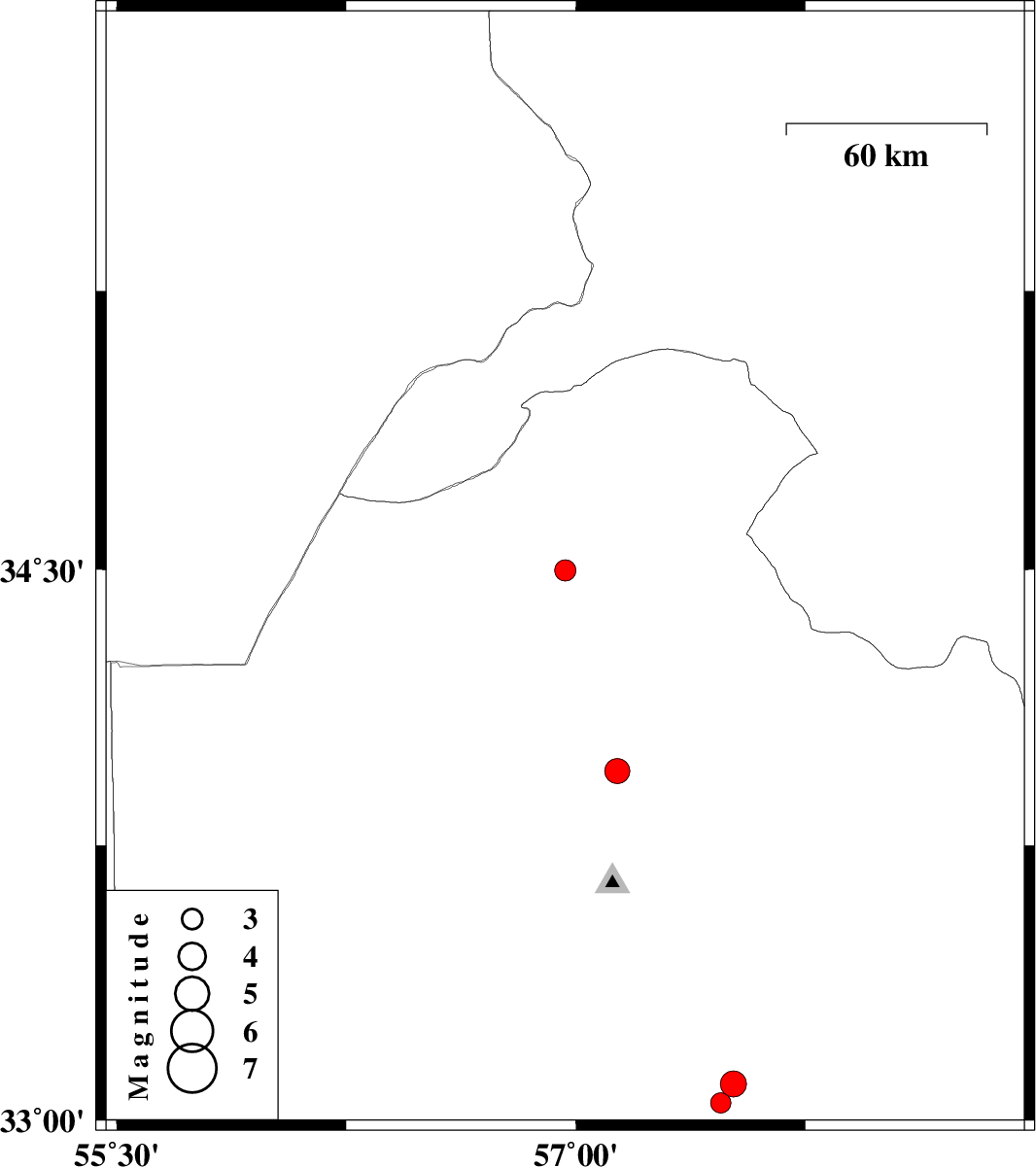 | 2023/08/04 | 18:00:10.1 | 21:30:10.1 | 33.953 | 57.135 | 12 | ML:3.6 | Khorasan(center) Province, 44 km North-East of Tabas | ||