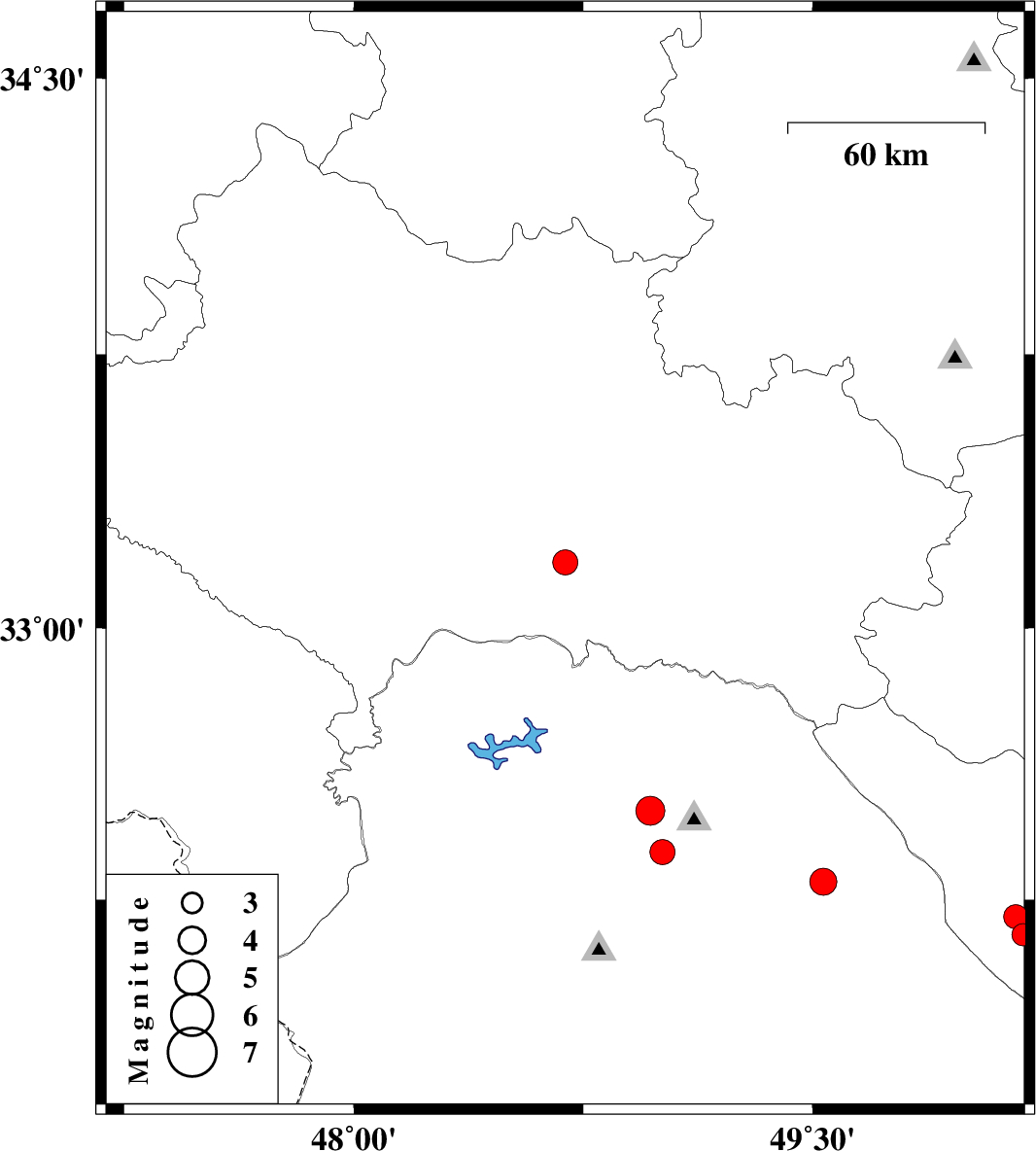 | 2023/08/27 | 10:17:25.5 | 13:47:25.5 | 33.181 | 48.691 | 12 | ML:3.6 | Lorestan Province, 45 km South-East of Khorramabad | ||