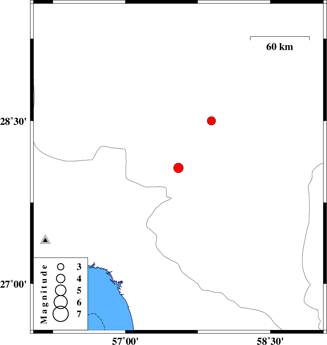 | 2023/09/02 | 14:30:37.9 | 18:00:37.9 | 28.069 | 57.549 | 19 | ML:4.5 | Kerman Province, 19 km North-West of Kahnuj | ||