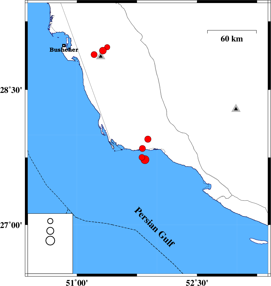 | 2023/09/07 | 14:16:30.5 | 17:46:30.5 | 27.953 | 51.886 | 12 | ML:3.7 | Bushehr Province, 22 km North-West of Bandar-e kangan | ||