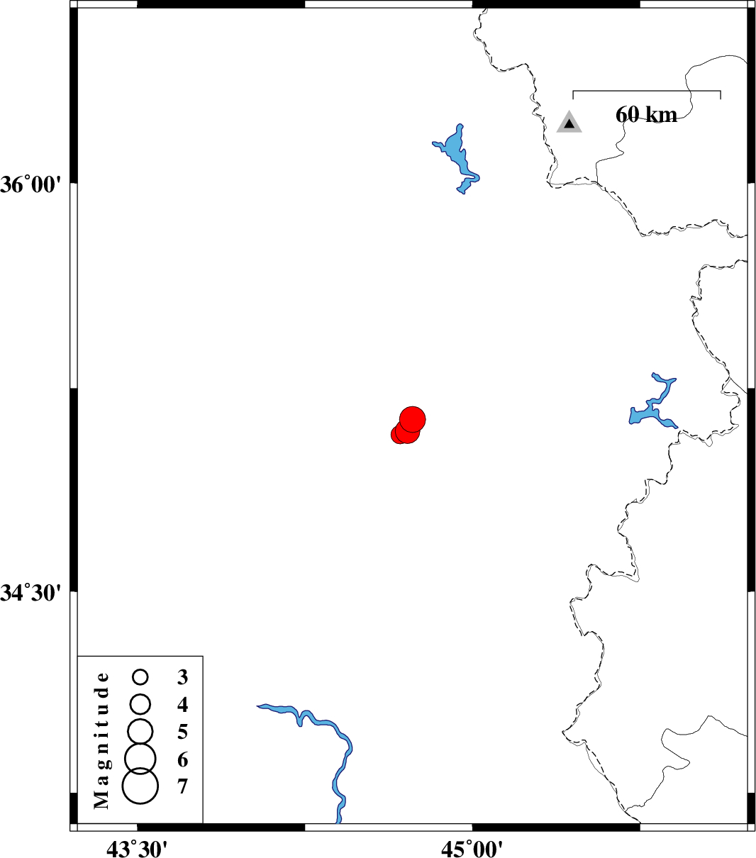 | 2023/09/10 | 21:43:51.3 | 01:13:51.3 | 35.135 | 44.731 | 12 | ML:5.2 | Iraq, 80 km South-West of Sulaymaniyah | ||