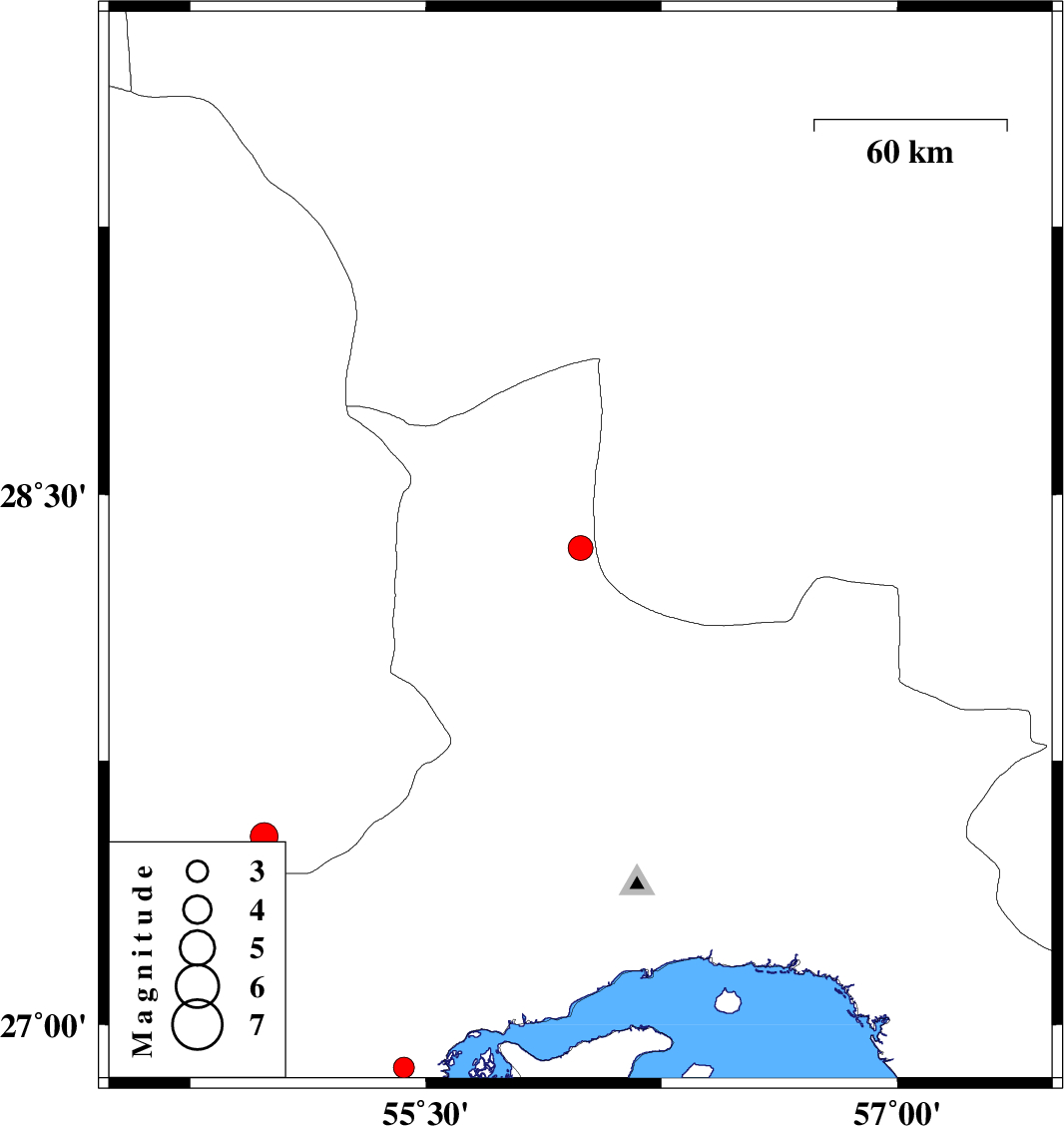 | 2023/08/20 | 08:48:23.2 | 12:18:23.2 | 27.534 | 54.985 | 12 | ML:4 | Fars Province, 66 km South-East of Lar |
