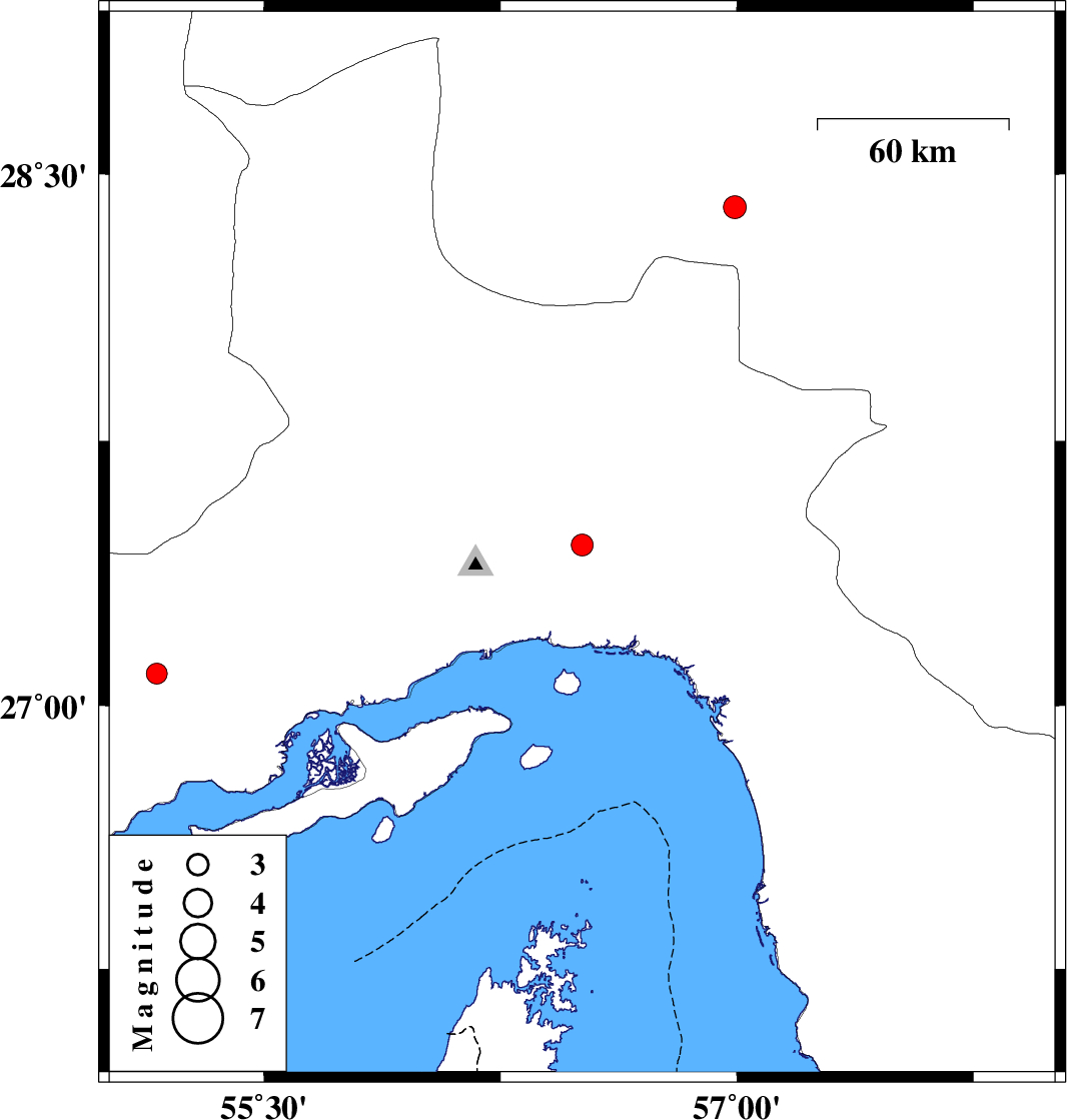 | 2023/09/25 | 02:04:23.5 | 05:34:23.5 | 27.091 | 55.16 | 12 | ML:3 | Hormozgan Province, 70 km North-East of Bandar-e lengeh |