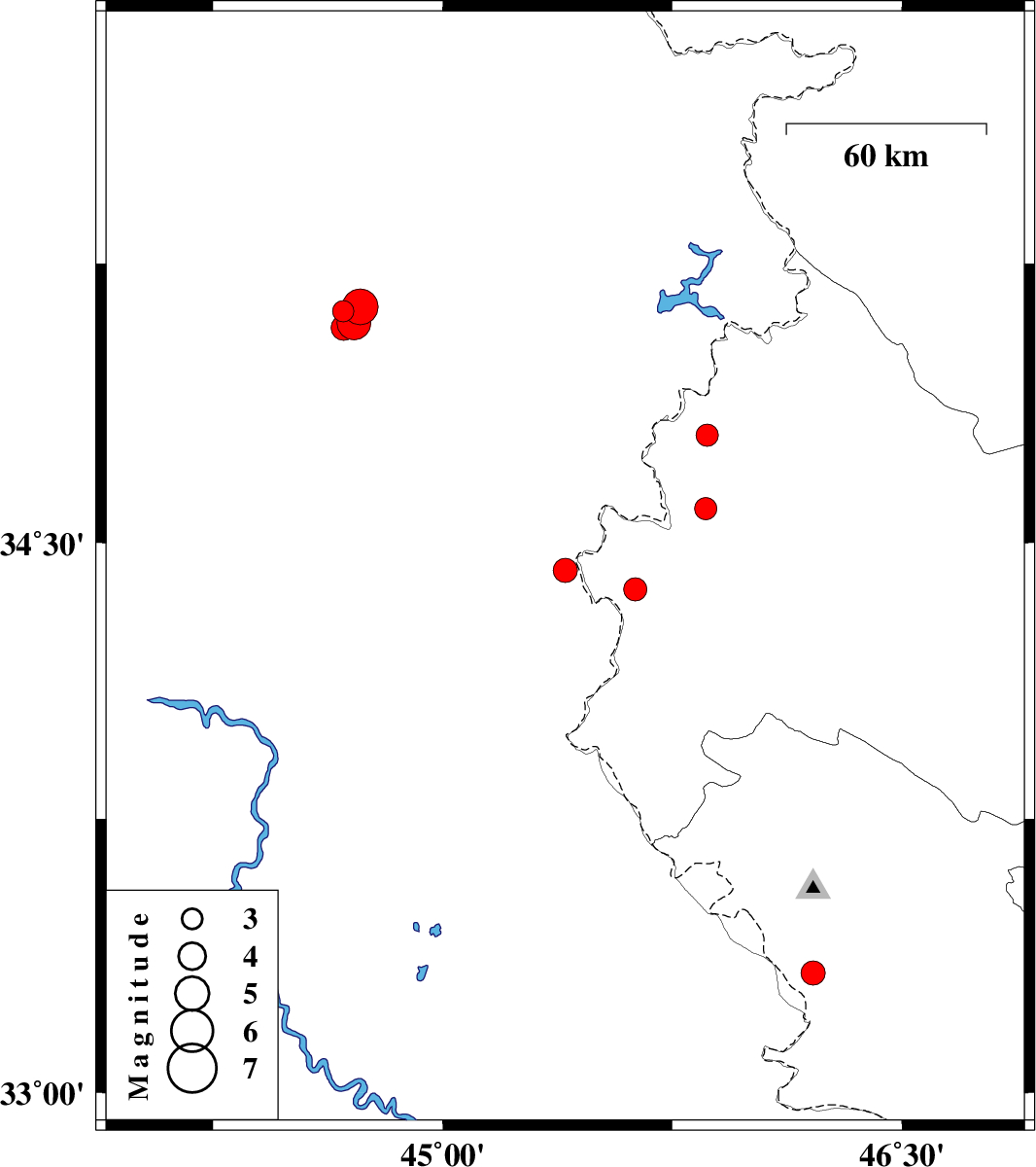 | 2023/09/11 | 06:45:58.3 | 10:15:58.3 | 35.123 | 44.675 | 12 | ML:3.1 | Iraq, 85 km South-West of Sulaymaniyah | ||