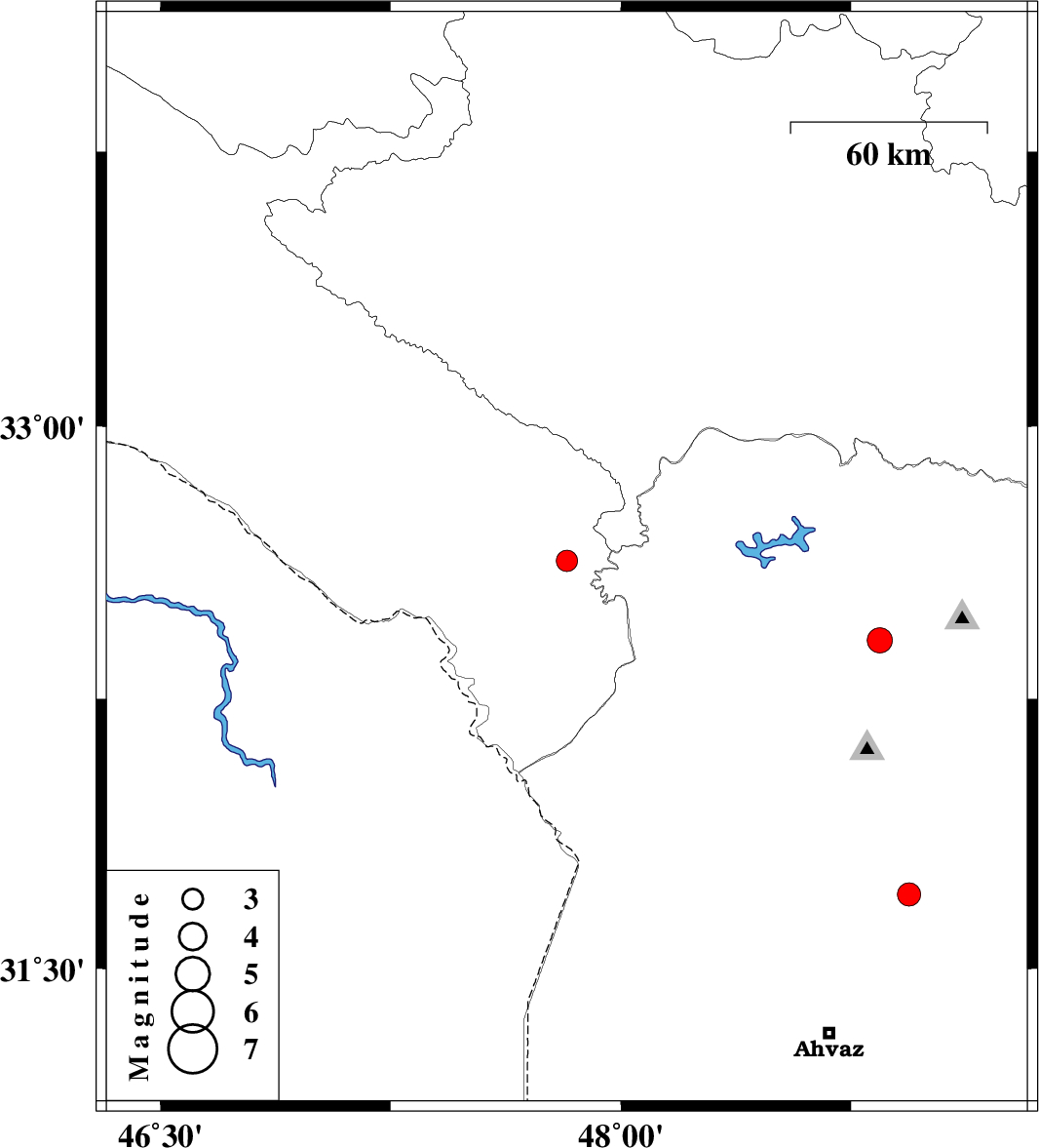 | 2023/10/11 | 06:48:37.1 | 10:18:37.1 | 31.707 | 48.938 | 12 | ML:3.4 | Khoozestan Province, 38 km South of Shushtar | ||
