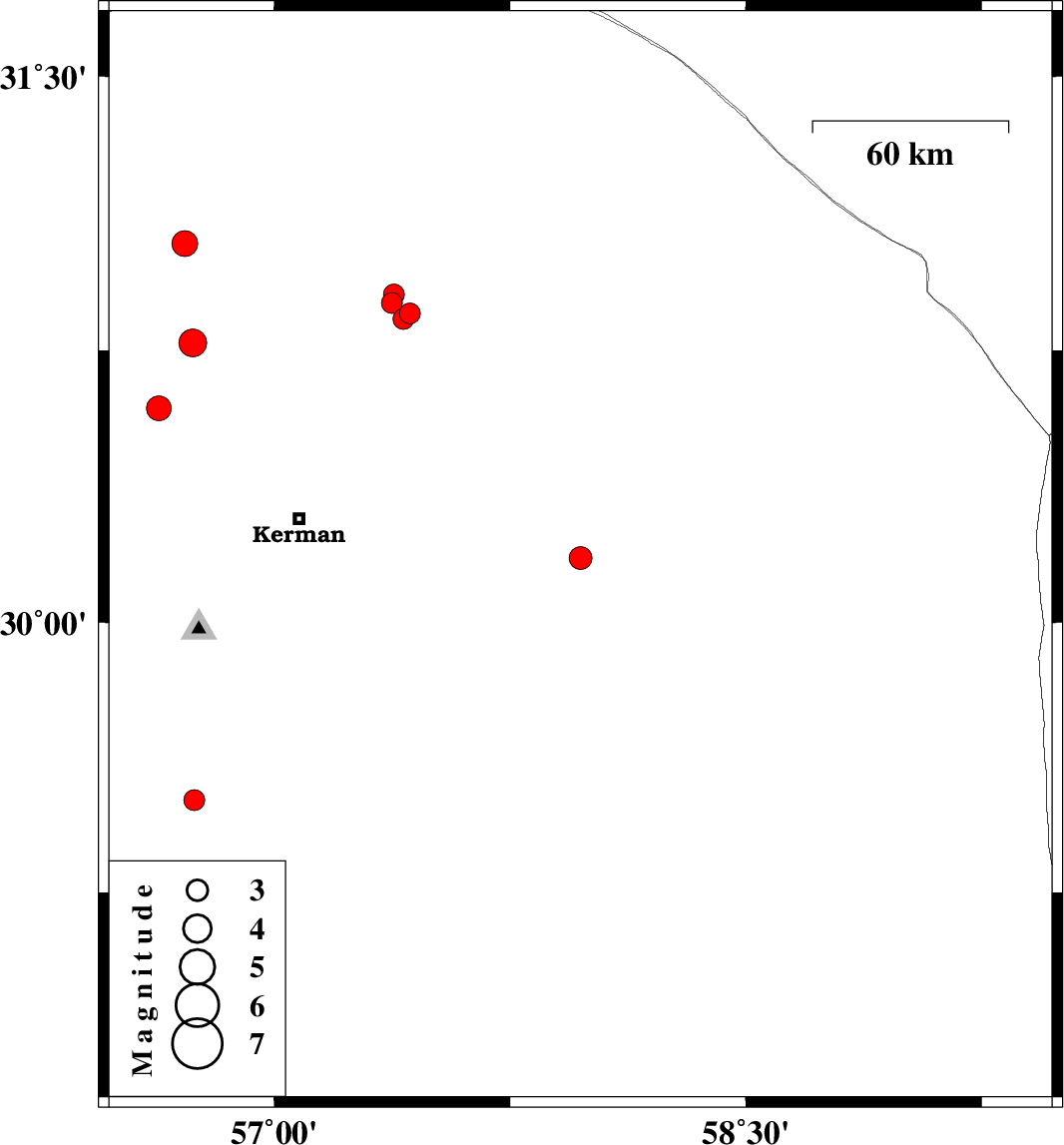 | 2023/09/29 | 01:39:12.4 | 05:09:12.4 | 30.904 | 57.38 | 12 | ML:3 | Kerman Province, 78 km -East of Zarand |