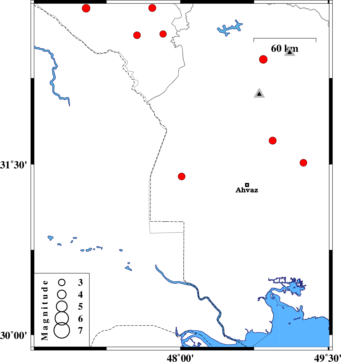 | 2023/10/25 | 05:06:50.2 | 08:36:50.2 | 31.394 | 48.013 | 16 | ML:3.2 | Khoozestan Province, 24 km South-West of Susangerd | ||