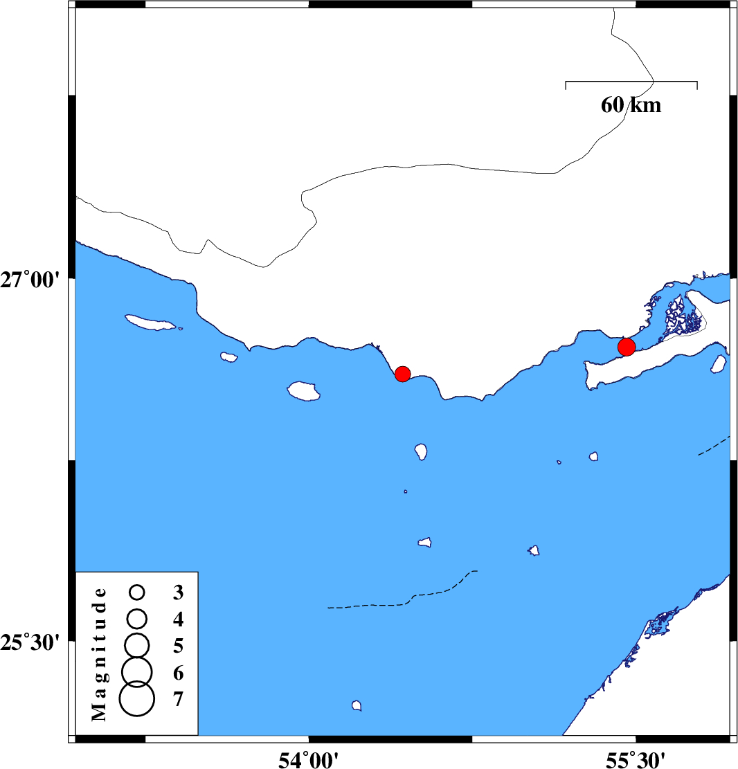 | 2023/10/23 | 10:58:23.8 | 14:28:23.8 | 26.717 | 55.458 | 25 | ML:3.6 | Persian Gulf, 64 km North-East of Bandar-e lengeh |