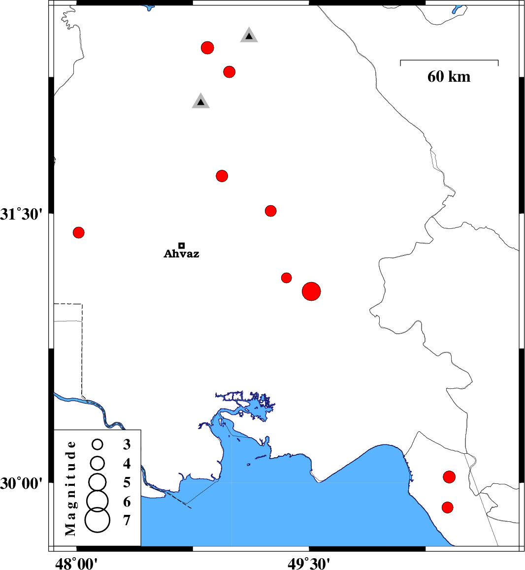 | 2023/10/25 | 05:06:50.2 | 08:36:50.2 | 31.394 | 48.013 | 16 | ML:3.2 | Khoozestan Province, 24 km South-West of Susangerd | ||