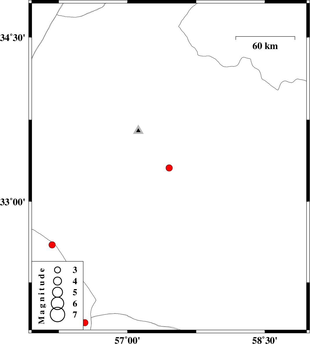 | 2023/11/18 | 21:07:50.0 | 00:37:50.0 | 33.308 | 57.455 | 10 | ML:3.3 | Yazd Province, 59 km South-East of Tabas | ||