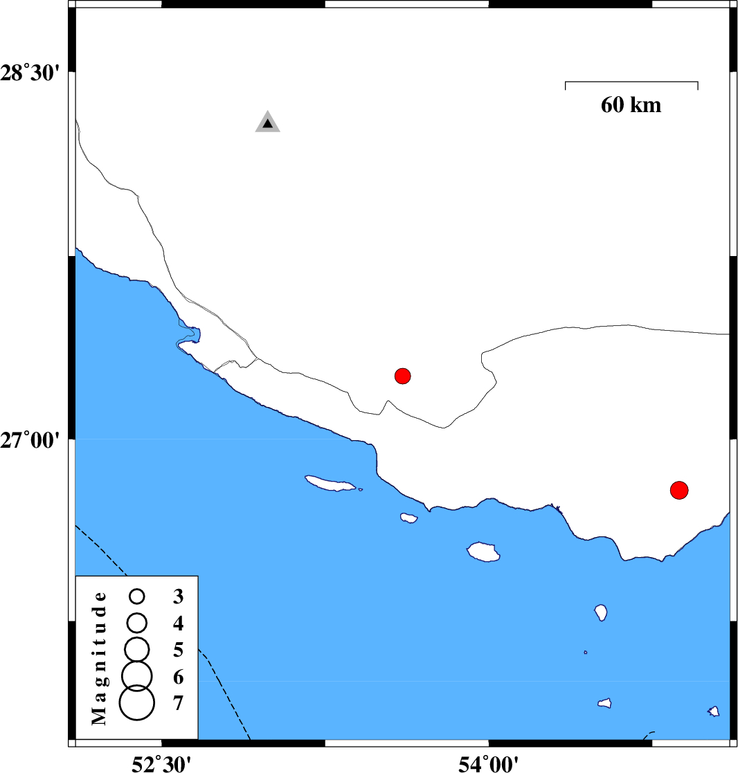 | 2023/12/11 | 02:23:01.0 | 05:53:01.0 | 27.259 | 53.605 | 10 | ML:3.3 | Fars Province, 44 km -East of Lamerd | ||