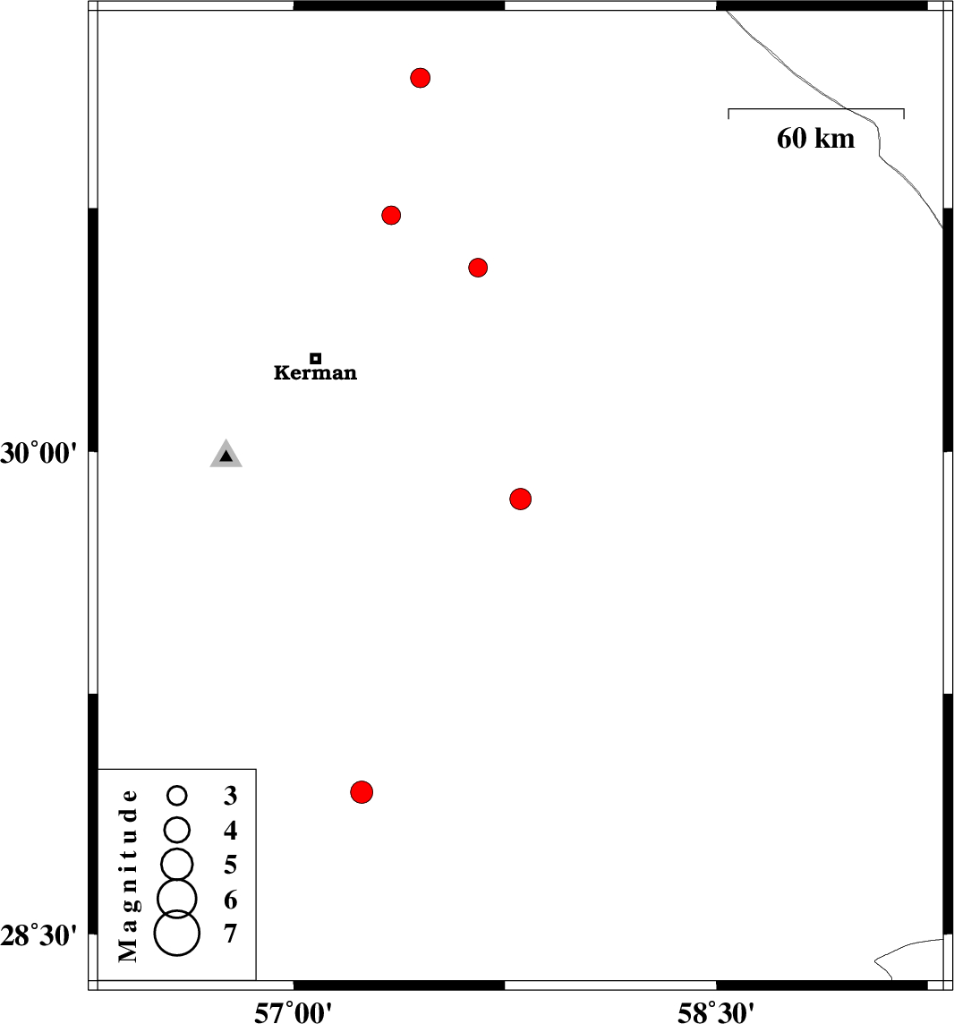 | 2023/12/30 | 17:45:59.2 | 21:15:59.2 | 29.854 | 57.805 | 12 | ML:3.4 | Kerman Province, 85 km South-East of Kerman | ||