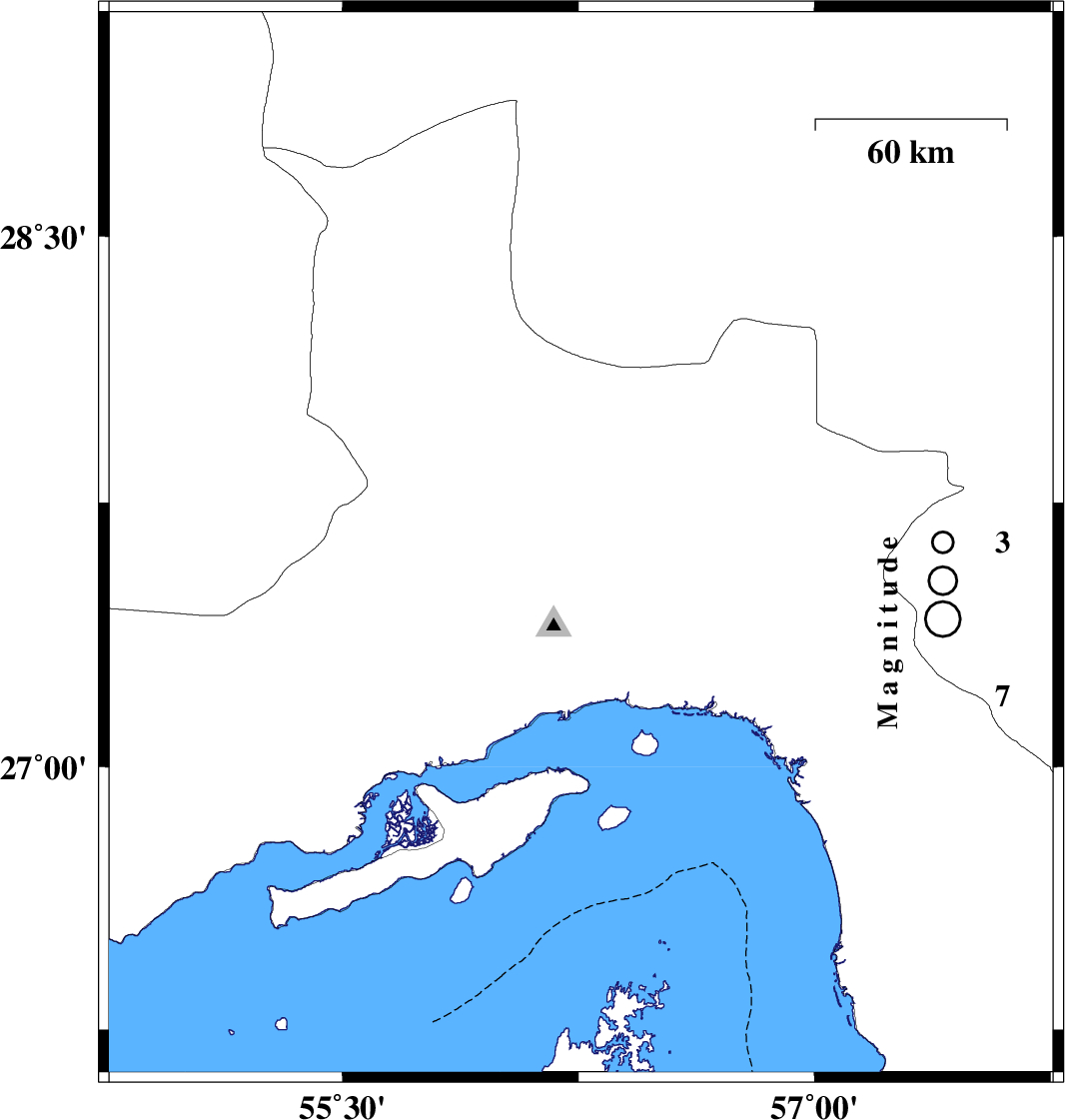 | 2024/01/04 | 19:09:03.7 | 22:39:03.7 | 26.709 | 55.428 | 12 | ML:3.1 | Persian Gulf, 61 km North-East of Bandar-e lengeh | ||