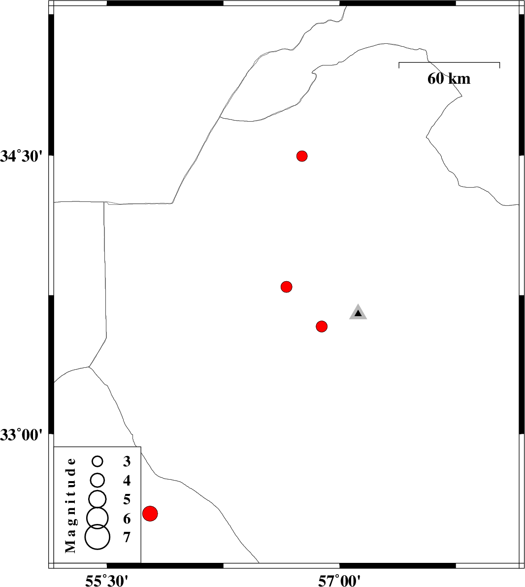 | 2024/01/08 | 14:00:58.8 | 17:30:58.8 | 33.795 | 56.657 | 9 | ML:3.3 | Yazd Province, 33 km North-West of Tabas | ||
