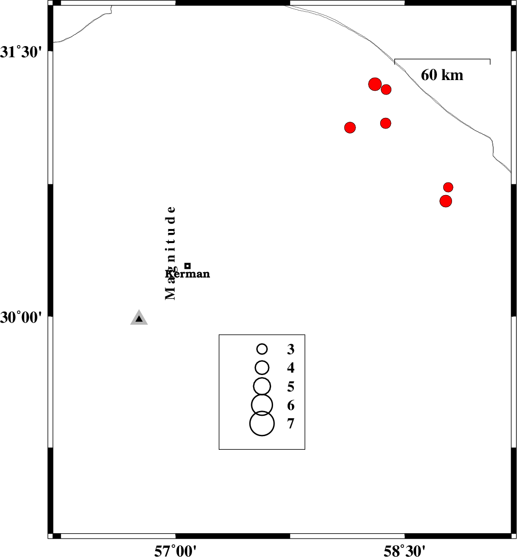 | 2021/02/27 | 02:37:13.0 | 06:07:13.0 | 30.594 | 57.054 | 12 | ML:3.2 | Kerman Province, 34 km North of Kerman | ||