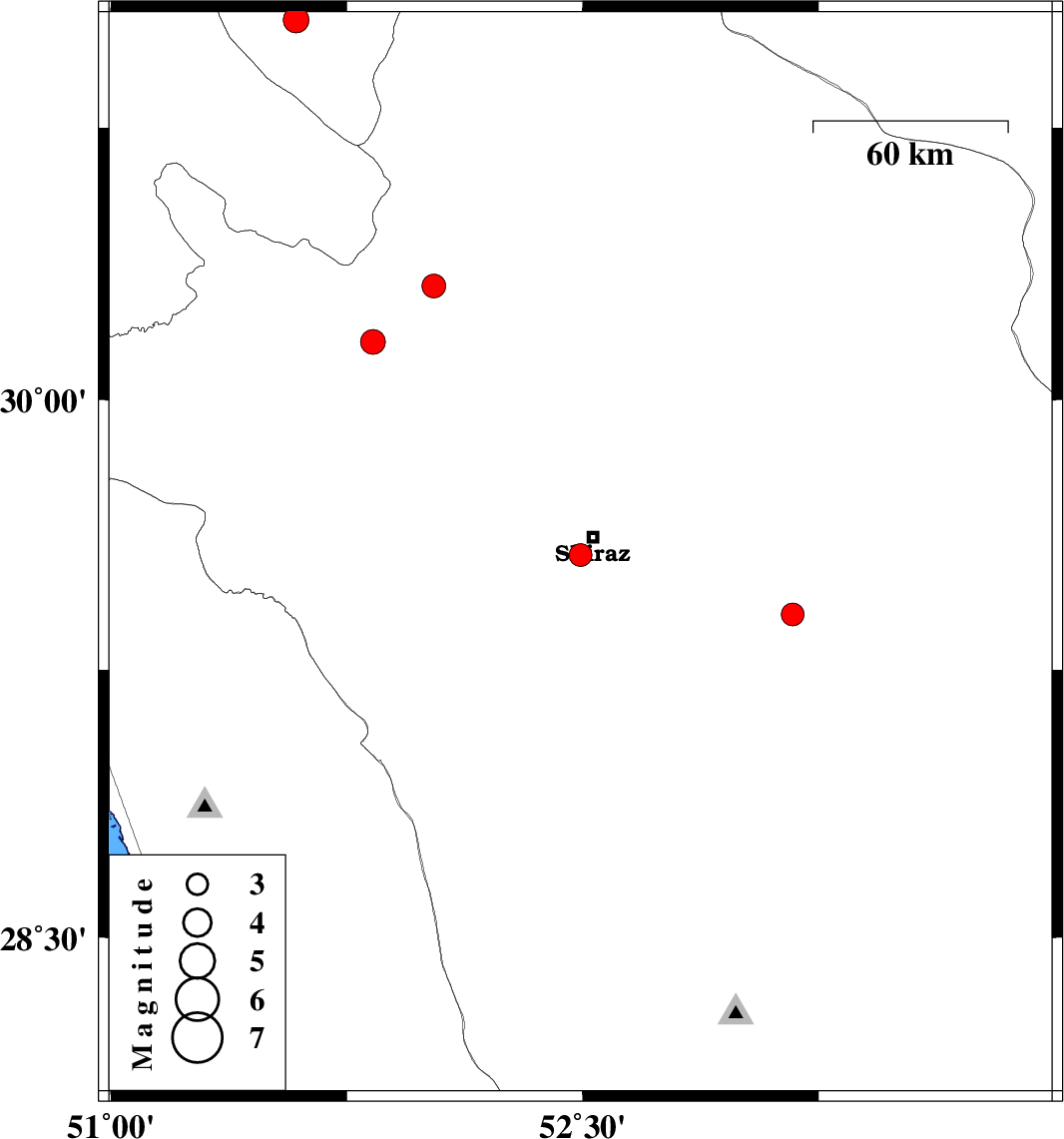 | 2024/01/31 | 03:29:54.8 | 06:59:54.8 | 29.569 | 52.493 | 8 | ML:3.3 | Fars Province, 7 km of Shiraz | ||