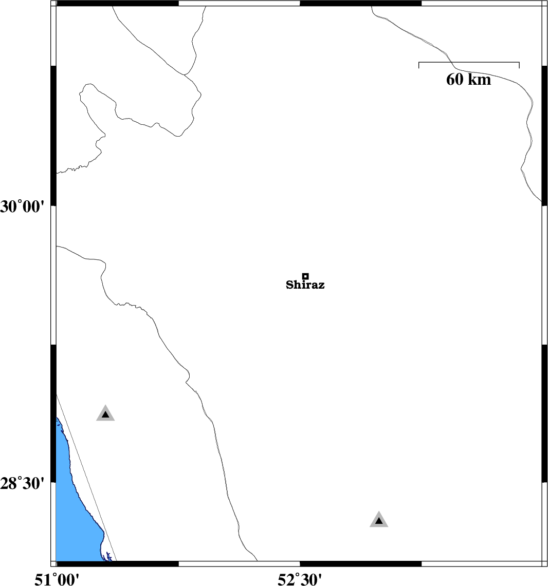| 2024/01/31 | 03:29:54.8 | 06:59:54.8 | 29.569 | 52.493 | 8 | ML:3.3 | Fars Province, 7 km of Shiraz |