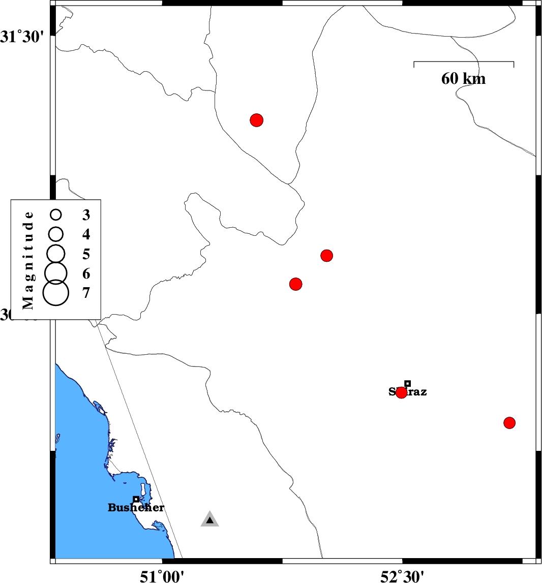 | 2024/01/31 | 03:29:54.8 | 06:59:54.8 | 29.569 | 52.493 | 8 | ML:3.3 | Fars Province, 7 km of Shiraz | ||
