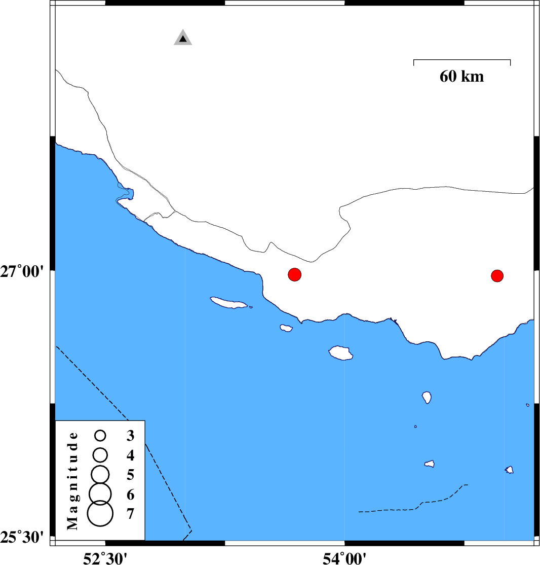 | 2024/02/04 | 01:52:06.2 | 05:22:06.2 | 26.968 | 54.956 | 10 | ML:3.4 | Hormozgan Province, 50 km North-East of Bandar-e lengeh |