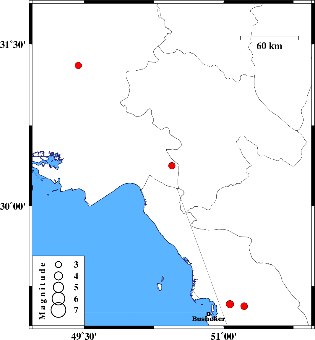 | 2024/02/07 | 01:25:31.8 | 04:55:31.8 | 29.078 | 51.067 | 16 | ML:3.6 | Bushehr Province, 25 km South-West of Borazjan |