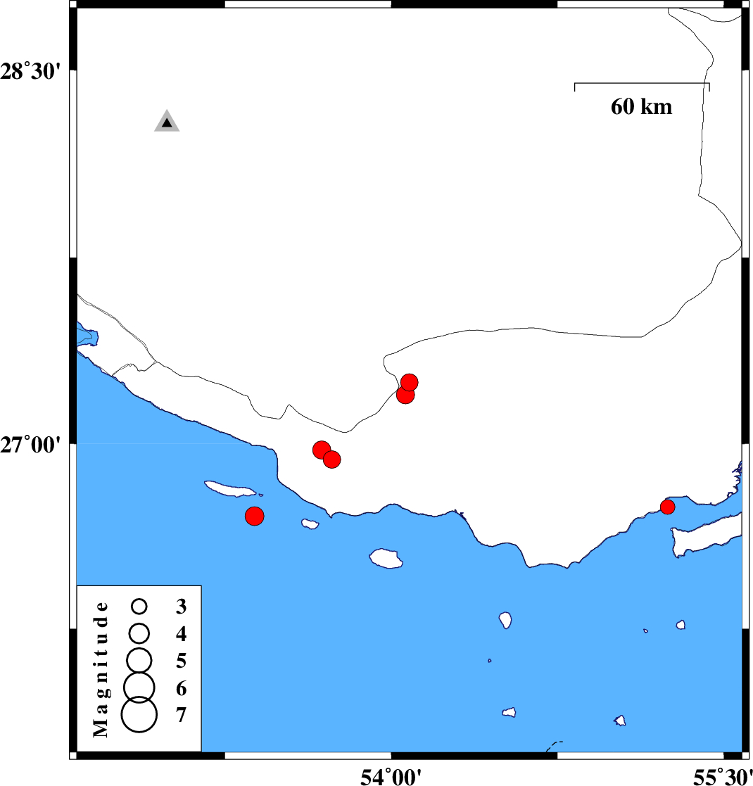 | 2024/03/06 | 15:46:49.0 | 19:16:49.0 | 26.707 | 53.382 | 12 | ML:3.8 | Persian Gulf, 73 km South-East of Lamerd | ||