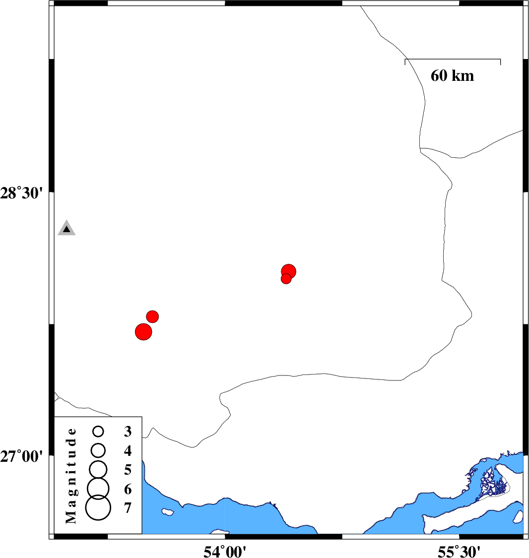 | 2024/03/23 | 19:57:39.7 | 23:27:39.7 | 28.049 | 54.407 | 12 | ML:4.3 | Fars Province, 42 km North of Lar | ||