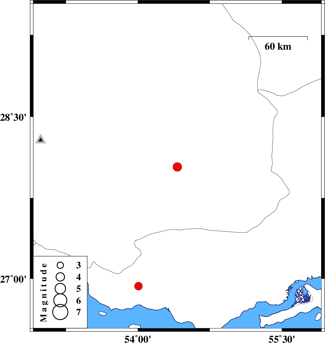 | 2024/04/05 | 05:05:38.5 | 08:35:38.5 | 28.037 | 54.411 | 14 | ML:4.1 | Fars Province, 40 km North of Lar | ||