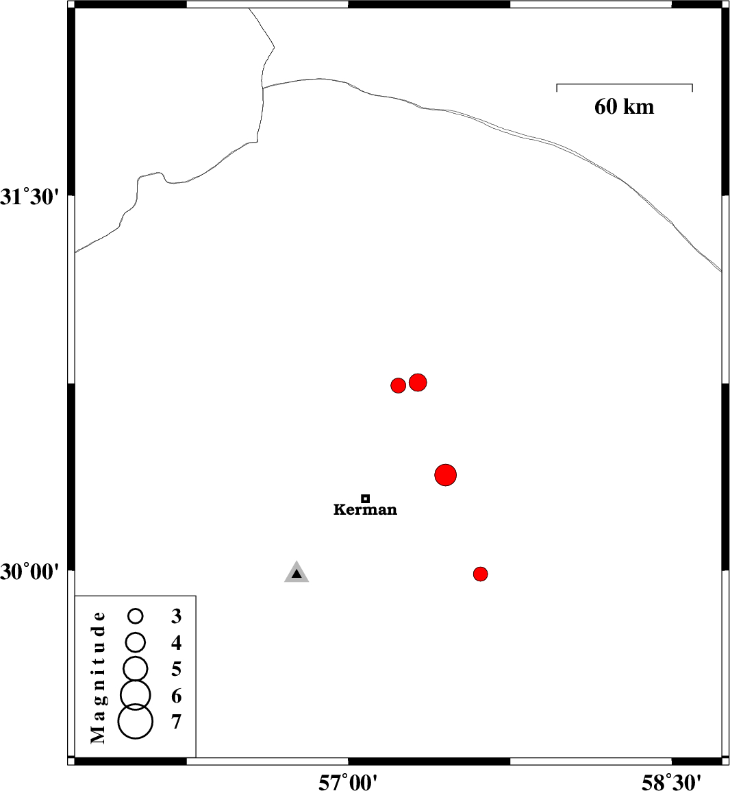 | 2024/03/26 | 07:04:33.2 | 10:34:33.2 | 29.984 | 57.612 | 8 | ML:3 | Kerman Province, 61 km South-East of Kerman |