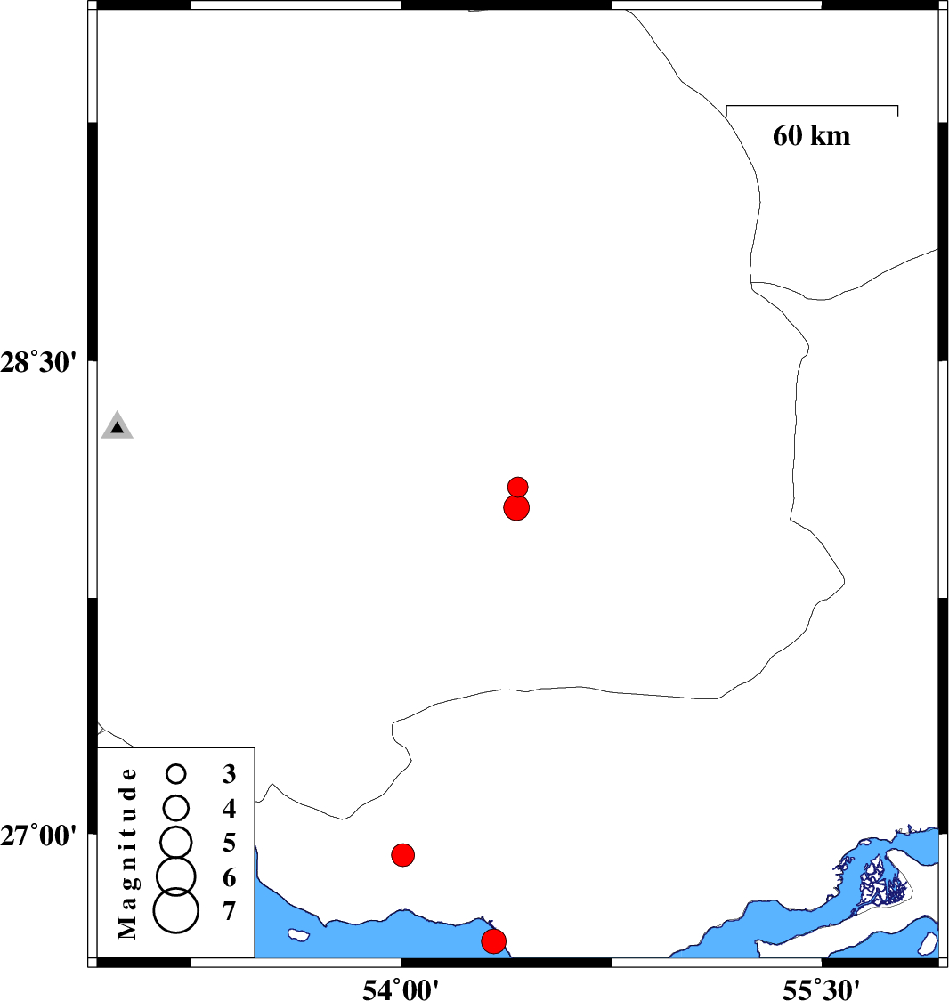 2024/04/06 | 04:54:51.5 | 08:24:51.5 | 26.655 | 54.329 | 12 | ML:3.9 | Persian Gulf, 60 km South of Bastak | ||