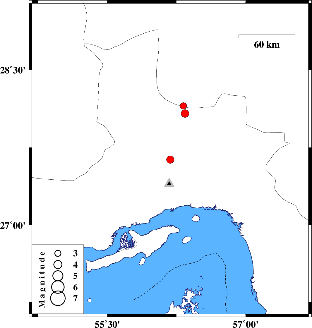 | 2024/04/17 | 10:29:30.9 | 13:59:30.9 | 28.078 | 56.343 | 12 | ML:3.8 | Hormozgan Province, 50 km South-East of Hajiabad |