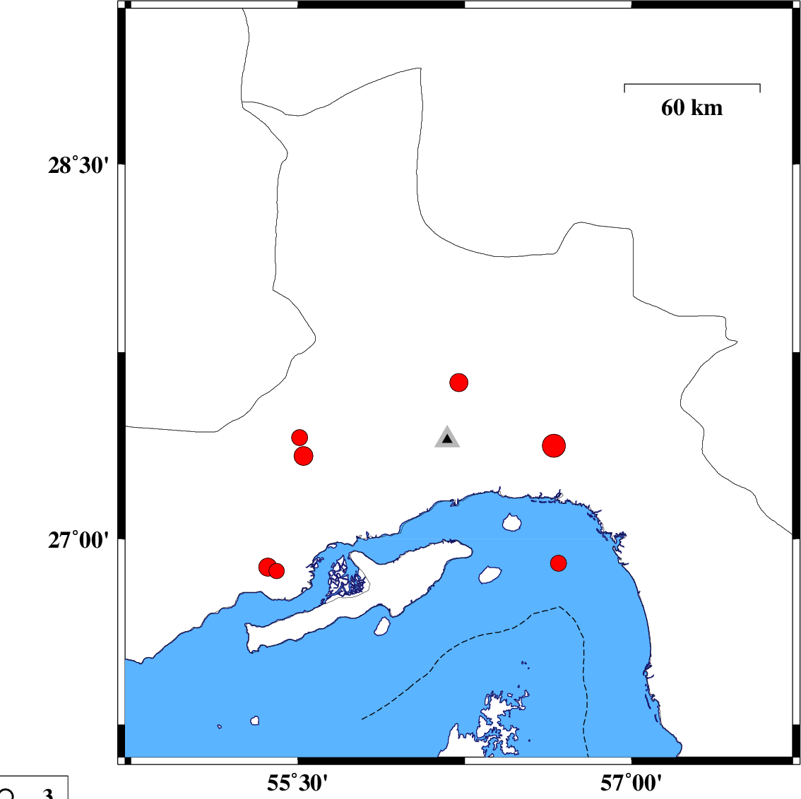 | 2024/04/20 | 00:08:06.0 | 03:38:06.0 | 26.672 | 55.115 | 17 | ML:3.4 | Persian Gulf, 31 km North-East of Bandar-e lengeh | ||