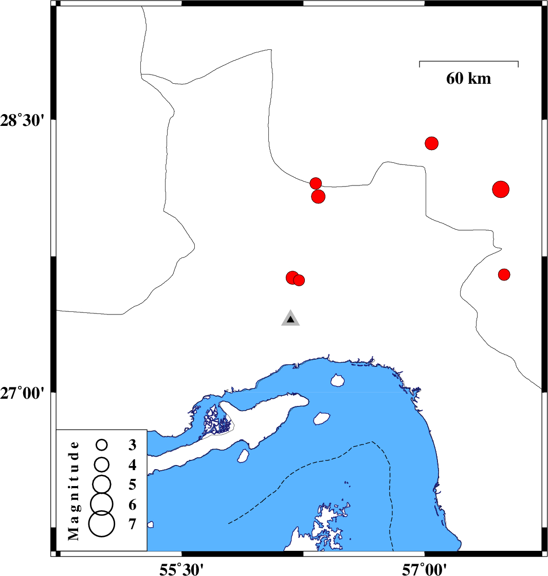 | 2024/04/17 | 10:29:30.9 | 13:59:30.9 | 28.078 | 56.343 | 12 | ML:3.8 | Hormozgan Province, 50 km South-East of Hajiabad | ||