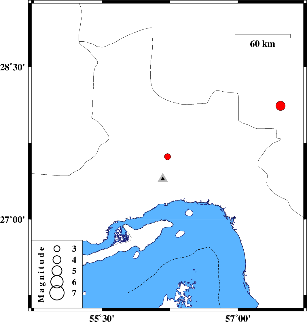 | 2024/05/02 | 04:23:45.8 | 07:53:45.8 | 28.118 | 57.47 | 10 | ML:4.6 | Kerman Province, 29 km North-West of Kahnuj |
