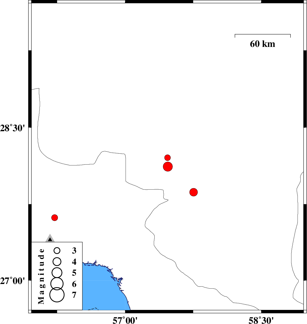 | 2024/05/24 | 10:33:31.9 | 14:03:31.9 | 27.868 | 57.755 | 6 | ML:4 | Kerman Province, 11 km of Kahnuj | ||