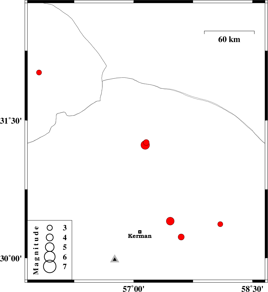 | 2024/05/30 | 01:07:45.4 | 04:37:45.4 | 31.233 | 57.146 | 16 | ML:4.9 | Kerman Province, 32 km -East of Ravar | ||