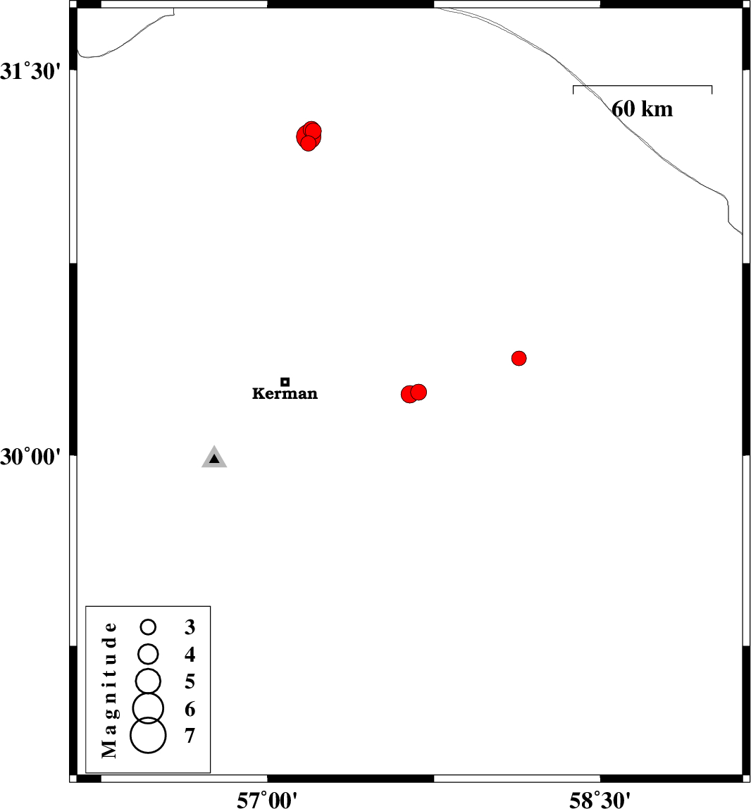 | 2024/05/15 | 07:26:09.5 | 10:56:09.5 | 30.372 | 58.094 | 12 | ML:3 | Kerman Province, 98 km -East of Kerman |