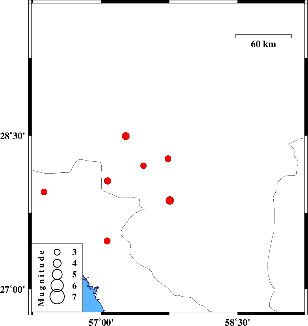 | 2024/05/24 | 10:33:31.9 | 14:03:31.9 | 27.868 | 57.755 | 6 | ML:4 | Kerman Province, 11 km of Kahnuj |