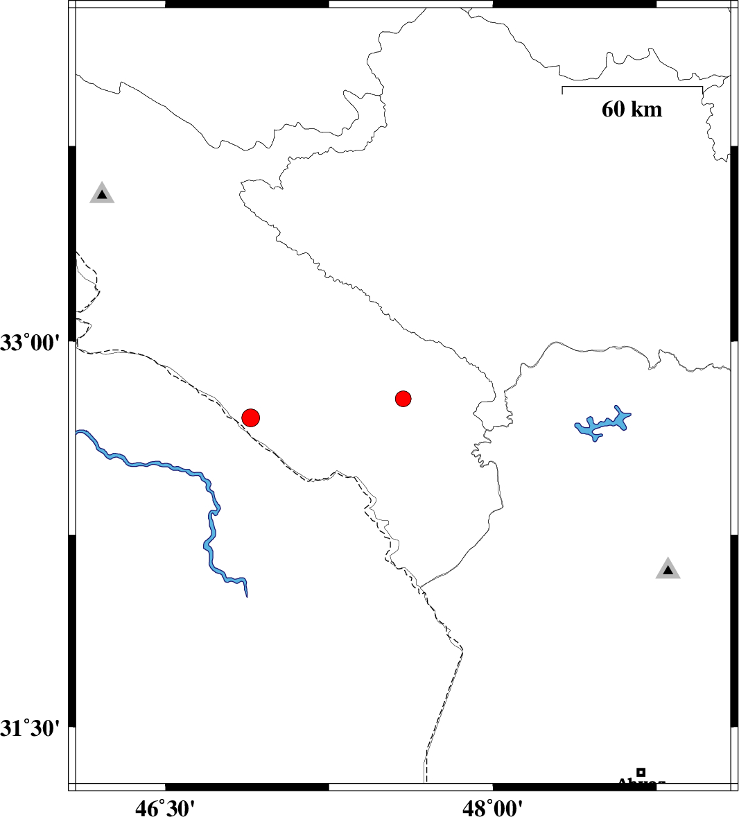 | 2024/06/17 | 05:45:13.7 | 09:15:13.7 | 32.778 | 47.589 | 12 | ML:3.3 | Ilam Province, 20 km South-East of Abdanan | ||