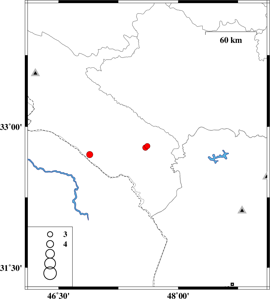 2024/06/17 | 05:45:13.7 | 09:15:13.7 | 32.778 | 47.589 | 12 | ML:3.3 | Ilam Province, 20 km South-East of Abdanan | ||